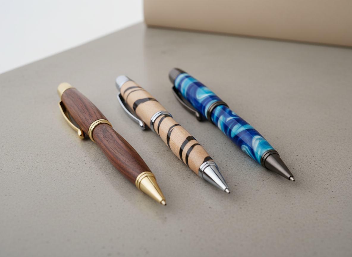 All materials + tools provided (pen kit hardware, wood/acrylic blanks, bushings, sandpaper, finishing supplies)